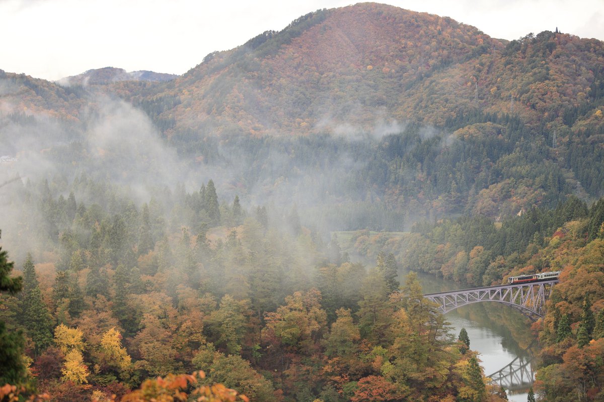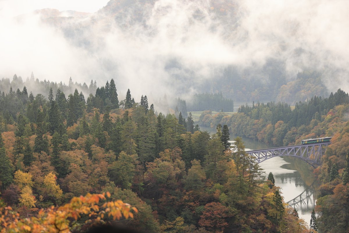 久々の只見川第一鉄橋。時節柄、ご多分も漏れず【熊出没注意!】。上段の撮影地は数日前に熊の目撃情報があり立ち入り禁止でした。 424Dの時間は霧がかかっていました。残念ながら水鏡にはならず。